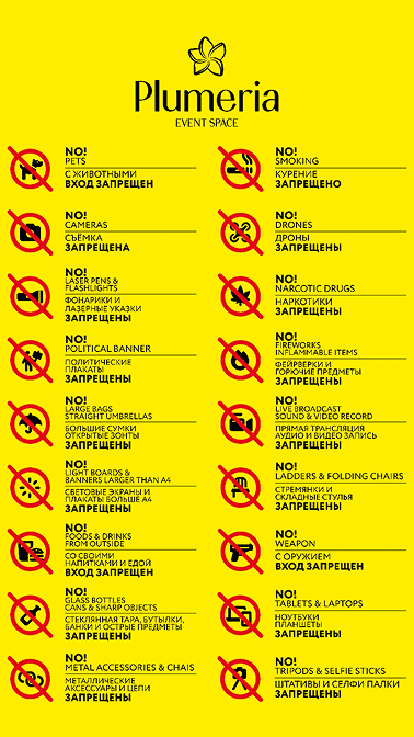 Для комфорта всех гостей создана визуальная карта предметов и действий, запрещённых на территории Plumeria Event Space. К ним относятся пронос собственных напитков и еды, любых видов оружия и пиротехники, профессиональной фото — и видеотехники без аккредитации, а также любых опасных, громоздких или мешающих другим гостей предметов.
